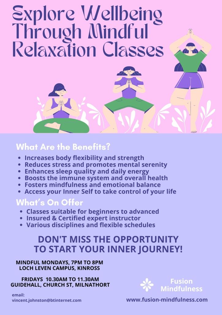 This month I am pleased to be going through a period of development, the Kinross Community Wellbeing Classes were limited to Friday mornings in the Milnathort Guidehall. Then the new Monday night class was launched at Kinross Community Campus where we began before lock down. I am now developing this website to promote the classes and Workshops in Central Scotland, Fife, Perth & Kinross.